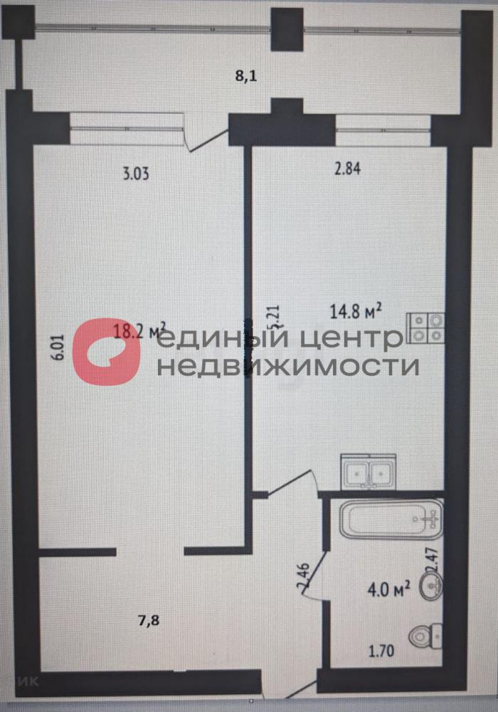 Просторная кухня-гостиная площадью 14.8 кв. м с зоной отдыха и просторная спальня.